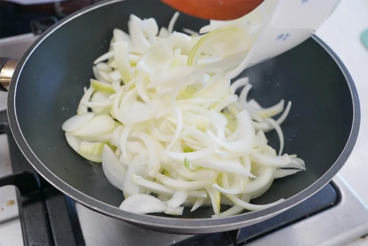 기름을 두른 팬에 채 썬 양파를 볶아주세요.
