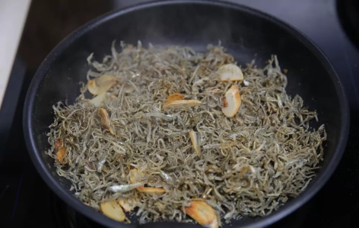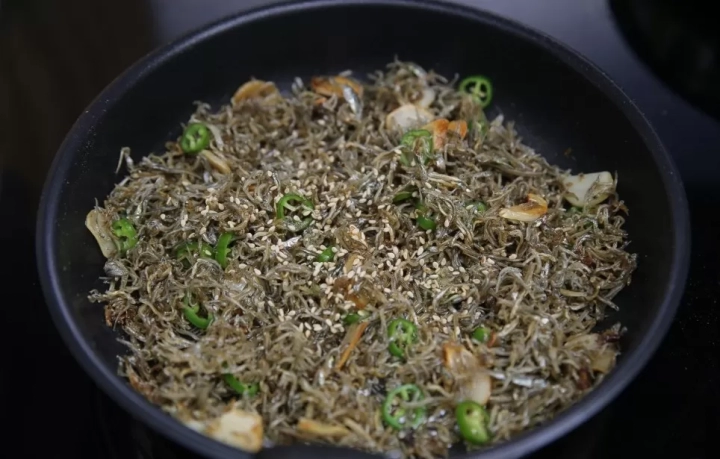마늘향이 올라오면 멸치를 넣어 볶아주세요.