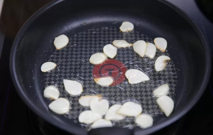 팬에 기름을 두르고 슬라이스 한 마늘을 볶아주세요.