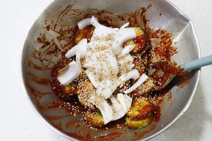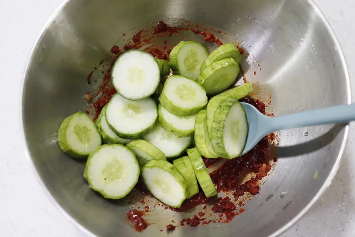 양념장에 오이를 넣은 뒤 조물조물 버무려주세요.