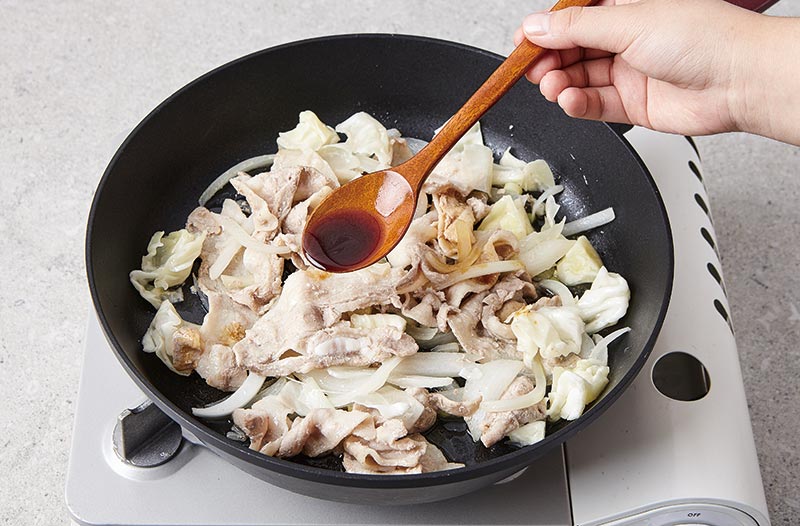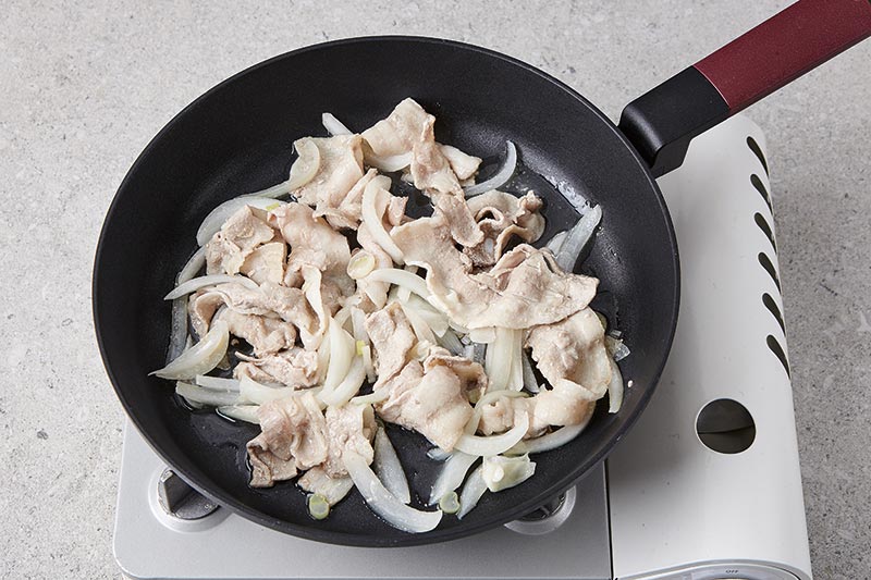 센불로 달군 팬에 양파와 파, 대패삼겹살을 볶아주세요.