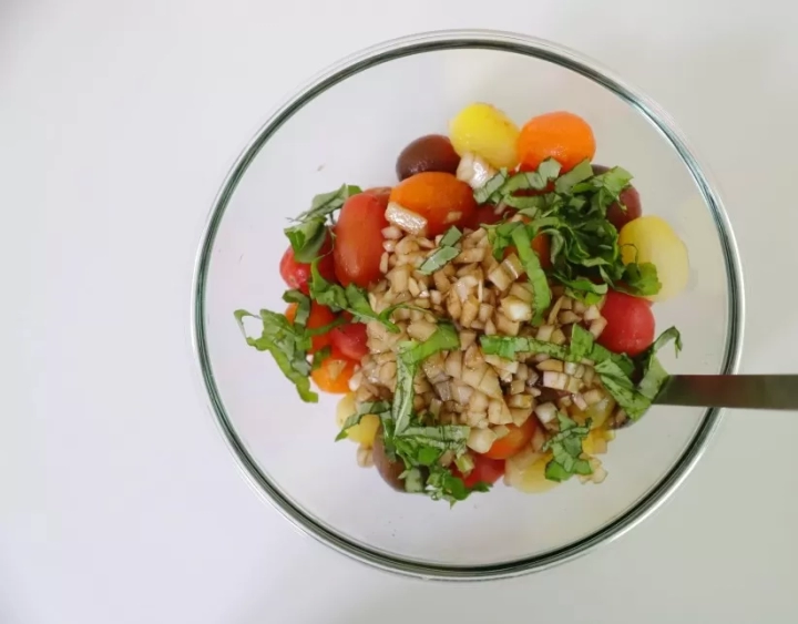 [재료]: 방울토마토 500g, 바질 5잎, 양파 1/2개