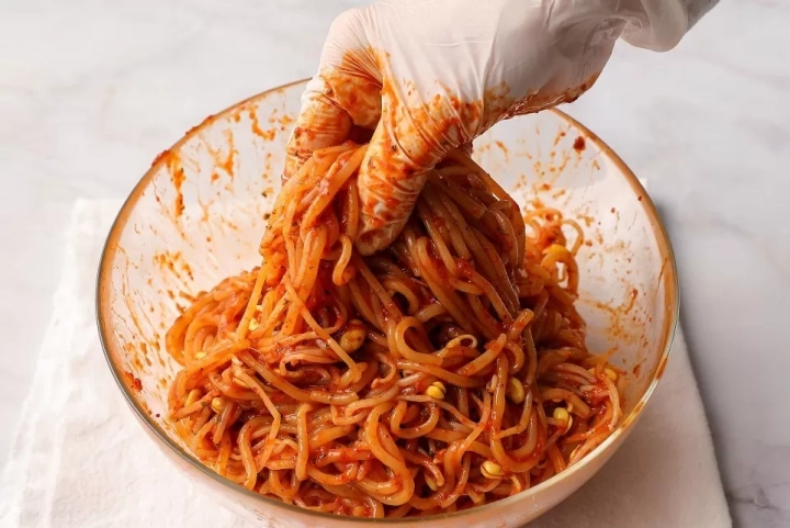 그릇에 콩나물, 쫄면을 담아주고 양념장을 더해 버무려주세요.