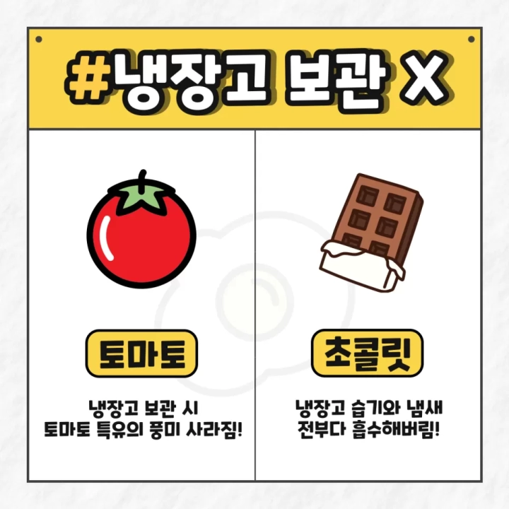 초콜릿은 냉장고의 습기와 냄새까지도 흡수하기 때문에 냉장고내에 있는 반찬들의 냄새까지 흡수하게 된다고 하는데요. 따라서 초콜릿은 햇빛이 들지 않는 서늘한 곳에 두거나 밀폐용기에 담아서 보관해야 한다고 합니다.