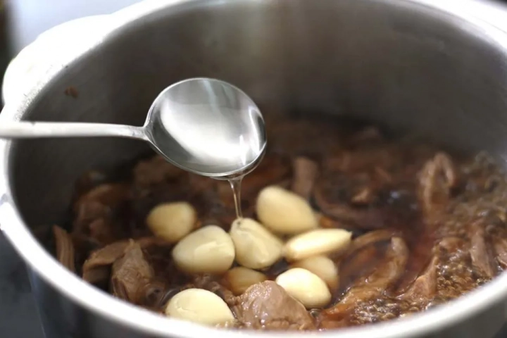 장조림 양념이 반 이상 줄어들면 통마늘을 넣고 끓여주세요.