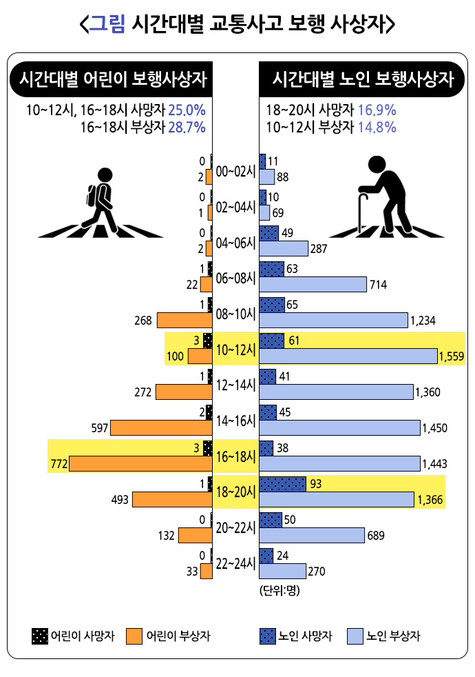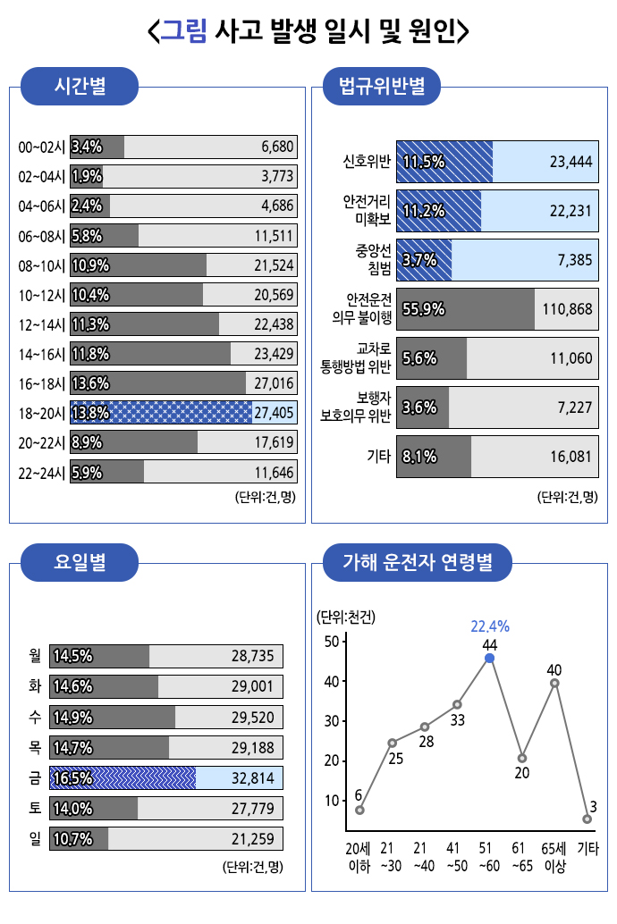 2023년 한국도로교통공단 자료에 따르면, 교통사고는 금요일(16.5%), 18시부터 20시 사이에(13.8%) 가장 많이 발생했으며, 신호위반(11.8%)과 안전거리 미확보(11.2%)가 가장 흔한 원인이었습니다. 나이는 51~60세 운전자(22.4%)가 가장 많았으며, 65세 이상도 많았습니다. 특히 65세 이상의 고령 보행자가 전체 보행 사망자(886명)의 반 이상(550명, 62.1%)을 차지했으며 어린이는 16~18시(부상 772명, 28.7%, 사망3명)에 65세 이상 고령자는 10~12시에 부상자(1559명, 14.8%)가 가장 많이 발생하고 18~20시에 사망자(93명, 16.9%)가 가장 많이 발생했습니다.