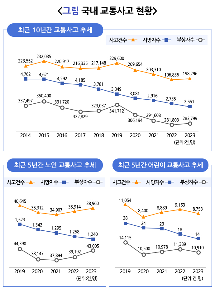 우리나라 교통사고 사망자수는 1991년 13,429명으로 최고치를 기록한 이후 매년 감소해, 2004년에는 약 절반 수준인 6,563명으로 줄었습니다. 2023년에는 총 198,296건의 교통사고가 발생해 2,551명이 사망하고 283,799명이 부상을 입었습니다. 2022년과 비교해 사고와 부상 건수는 소폭 증가했으나, 사망자 수는 감소한 결과입니다. 인구 10만 명당 교통사고 사망자 수는 2010년 11.3명에서 2023년 5.0명으로 줄었지만, 여전히 OECD 국가 중 높은 편입니다.