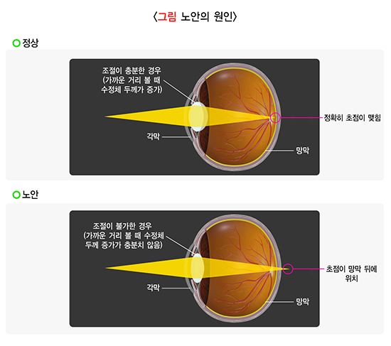 노안은 연령의 증가와 함께 오는 자연적인 현상이나, 시력저하는 노안 이외의 다른 원인질환일 가능성이 있을 수 있으므로 안과 전문의의 진료가 필요합니다.