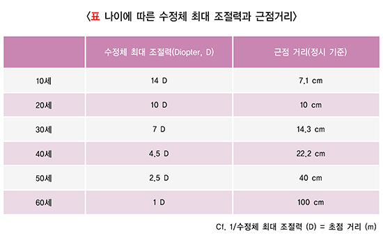 최대조절력의 감소에 따라 근점거리(조절을 최대로 했을 때 사물을 명확하게 볼 수 있는 눈에서 가장 가까운 거리)가 멀어지고, 근점거리가 25 cm 이상이 되면 근거리 작업에 불편을 느끼며 노안 증상을 느끼기 시작합니다.