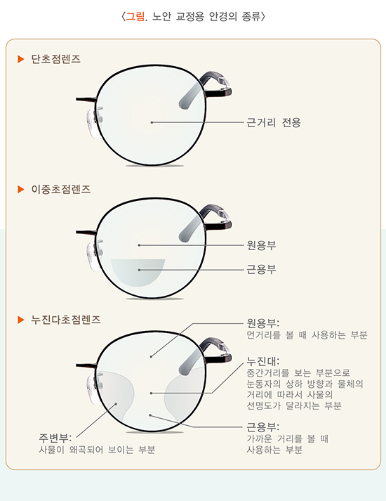 노안 교정을 위해서는 필요에 따라 원거리용, 근거리용 안경을 따로 사용하거나, 이중초점 혹은 누진다초점렌즈 안경을 착용할 수 있습니다. 이중초점 혹은 누진다초점렌즈는 안경의 윗부분으로는 원거리, 아래부분으로는 근거리를 볼 수 있게 다른 굴절력의 렌즈를 합친 것으로, 거리에 따라 여러 개의 안경을 구비해야 하는 번거로움을 줄여줍니다. 한쪽 눈은 원거리, 반대쪽 눈은 근거리가 잘 보이도록 안경이나 콘택트렌즈를 사용하는 단안시(monovision) 방식의 교정도 일부 환자에서 효과적입니다.