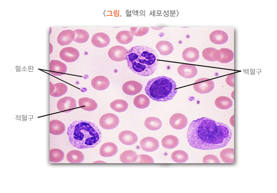 혈액은 혈장이라고 불리는 액체부분과 세포성분으로 되어 있으며, 혈장 안에 들어 있는 혈액의 세포 성분은 크게 세 종류로 구성되어 있습니다.