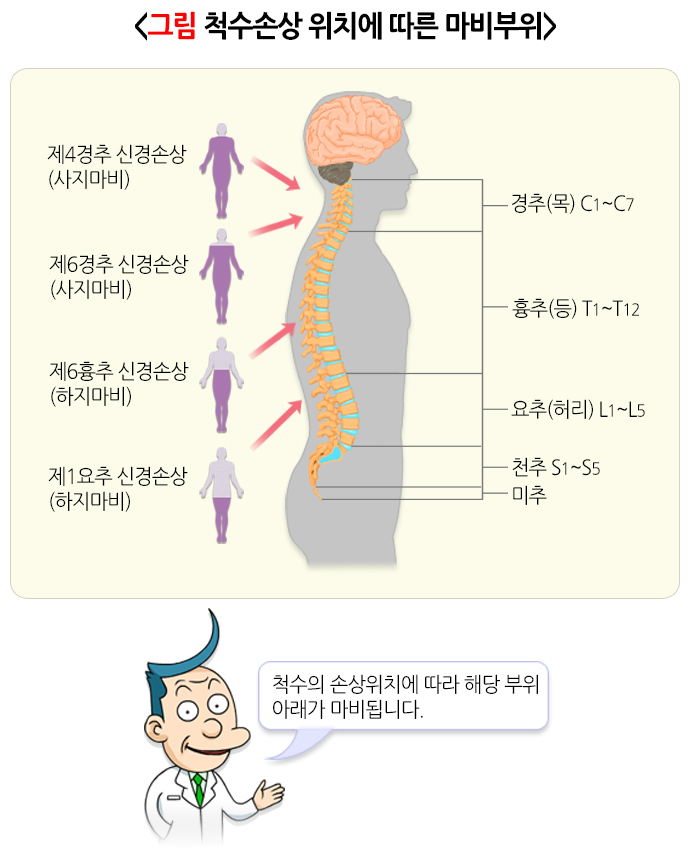척수(spinal cord)는 뇌에서 나와 전신으로 이어지는 신경다발이 모여있는 것으로 척추 뼈 안의 척추강(spinal canal)이라는 공간 안에 위치한 굵은 신경다발입니다. 외상성 척수손상은 척추 뼈의 손상 등에 의해 척추 뼈 안에 있는 이 신경다발, 즉 척수(spinal cord)가 손상되는 것을 의미합니다.