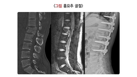 골절이나 탈구가 있을 때 수술적 치료는 나사못 등을 이용해서 손상된 척추 부위를 맞추고 고정하여 척추의 불안정성을 없애는 치료를 하게 됩니다. 신경 압박이 동반되어 있는 경우에는 뼈의 일부를 절제하여 신경압박을 풀어주는 후궁절제술 등이 같이 시행되기도 합니다.