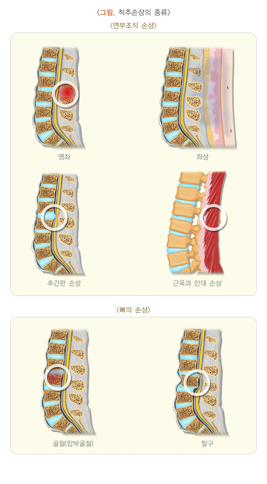 가장 흔한 형태의 척추 손상인 연부조직 손상에는 염좌(Sprain)와 긴장(strain)이 있습니다. 염좌는 인대의 부분적인 손상을 뜻하고, 긴장은 근육의 손상에서 오는 통증을 의미합니다. 하지만 진찰이나 검사로 두 손상을 명백하게 구분하기 힘들고, 두 손상 모두 일반적으로 가벼운 손상으로 분류하며, 보존적인 치료로 대부분 좋아지기 때문에 흔히 두 용어를 섞어 사용하기도 합니다.