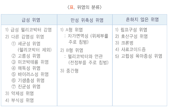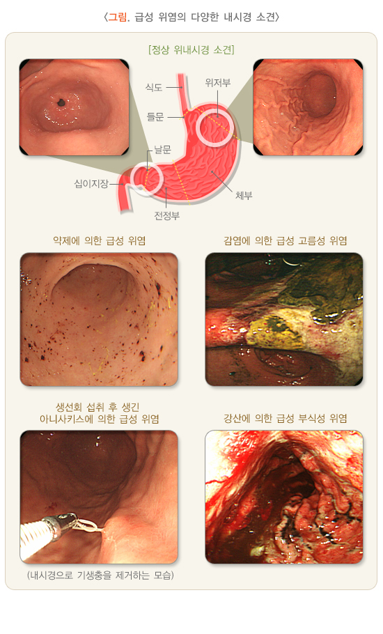 그 외에 우리나라에서 흔한 급성 위염으로는 생선회 섭취 후 발생하는 아니사키스 감염이나 강산 또는 강알칼리 용액으로 인한 부식성 위염이 있습니다.