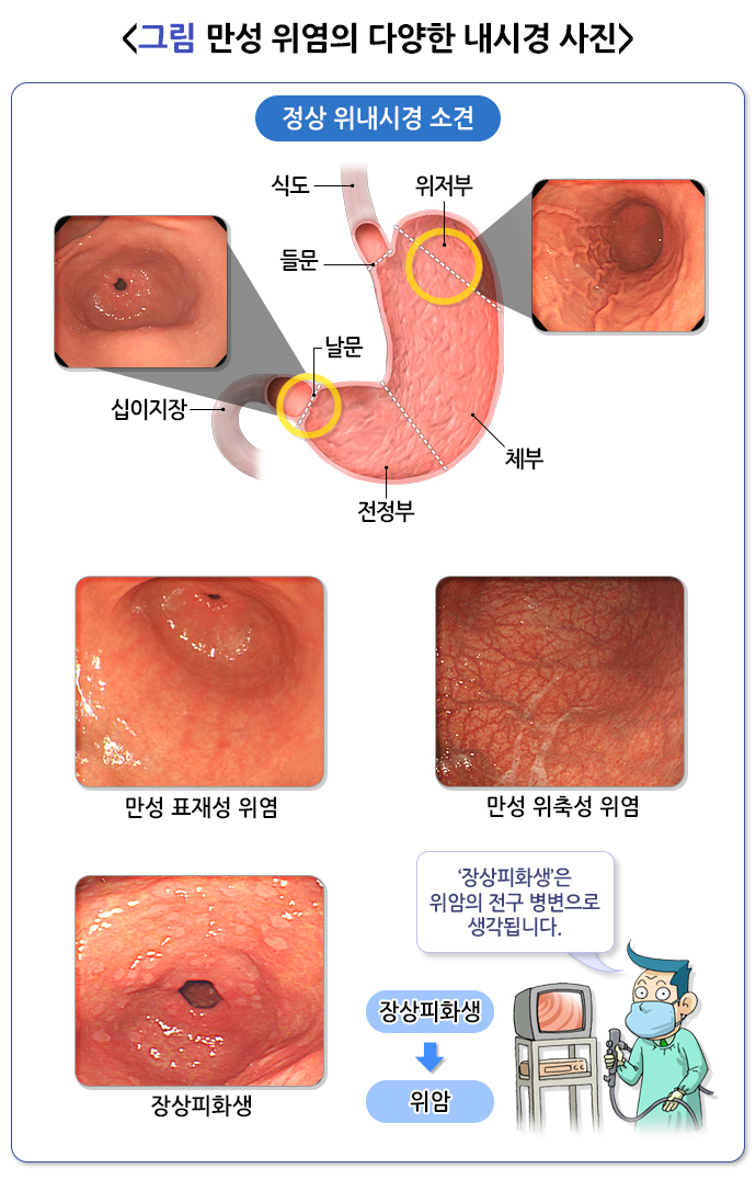 만성 위염은 위 점막의 만성 염증성 변화입니다. 염증이 오래 지속되면 위 점막이 얇아지는 위축성 위염과 위점막이 장점막으로 변하는 장상피화생이 발생합니다. 조직학적으로는 림프구와 형질세포의 침윤이 관찰되는데, 초기에는 점막 위층과 위샘 주위에 국한됩니다. 염증이 진행되면 위샘 구조가 파괴되면서 점막의 위축 및 장상피화생이 생깁니다. 만성 위염의 단계를 구체적으로 살펴보면, 초기에는 염증성 변화가 위 점막층의 표면에 국한되어 ‘표재성 위염’이라고 부릅니다. 염증이 점막층의 더 깊은 부위까지 파급되면 위샘 구조가 점차적으로 파괴되는 ‘위축성 위염’이 되며, 이때 내시경 검사를 시행하면 점막이 아주 얇아져서 혈관이 보입니다. 위축성 위염이 진행되면 위샘의 구조와 형태가 점차 소장샘이나 대장샘과 비슷하게 변합니다. 이것을 ‘장상피화생’이라 하며, 위암의 전구 병변으로 생각합니다.