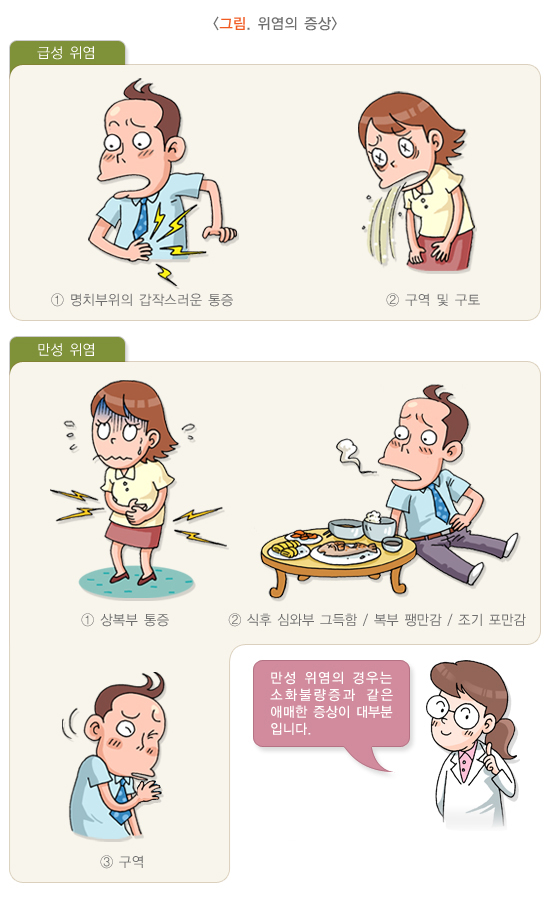위염에만 특징적인 증상은 없기 때문에 소화불량, 명치통, 구역감, 속쓰림 등이 있을 경우에는 의사의 진료를 받아야 합니다.