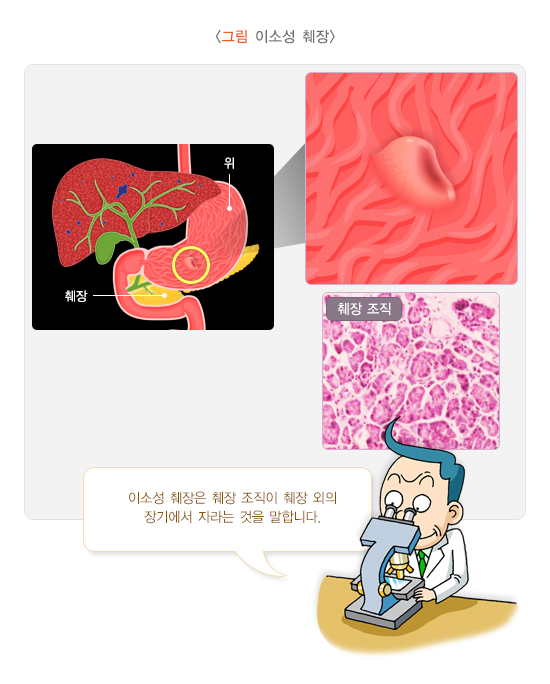 이소성 췌장은 췌장조직이 췌장 외의 장기에서 자라는 것으로 유병률은 약 2% 정도로 보고됩니다. 흔히 발견되는 장소는 위 전정부나 십이지장이나 유두부 주변에 위치합니다. 대개 우연히 발견되고 무증상이며 치료가 필요하지 않지만, 다른 종양과의 감별진단이 문제가 되며 드물지만 췌장염 , 췌장암 이 생기기도 합니다. 내시경 소견으로 대부분 위 전정부의 대만부에 2 cm 미만의 크기로 보이며 정상 점막으로 덮여있고 표면에 중심 함몰이 관찰됩니다.