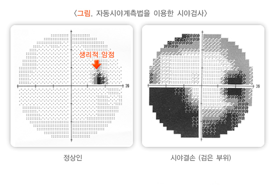 그림과 같이 정상인의 결과지는 생리적 암점을 제외한 대부분이 하얗게 나타나고, 시야결손 결과지는 많은 부분이 검게 표시됩니다. 시야검사에서 암점이나 어둡게 나타나는 부분이 있을 경우 녹내장, 시신경질환, 망막질환 등을 의심해볼 수 있습니다. 자동시야계측법은 검사자의 숙련도에 따라 크게 좌우되지 않는 장점이 있습니다. 그러나 유·소아는 협조가 어려울 수 있어 밝은 불빛이나 인형 등을 사용하여 직접 대면검사를 시행합니다.