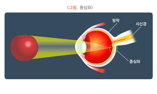 수정체를 통과하며 굴절된 빛은 망막의 중심와에 초점이 맺힙니다. 중심와에는 시각세포들이 밀집되어 있고, 영상이 시각세포와 시신경을 통해 뇌의 시각중추로 전달되어 사물을 볼 수 있습니다. 이때 눈이 주시하는 주시점에서 약 30도 정도의 중심부 시야는 특히 중요합니다.