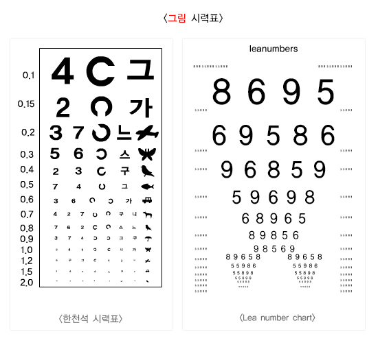 검사에 협조할 수 있다면 원거리와 근거리 시력을 모두 측정하는 것이 좋습니다. 시력검사 시표로는 원거리용으로 한천석 시력표, 0.1 이하 시력을 확인하는 파인블룸 차트(Feinbloom chart) 등이 있고, 근거리 시표로는 Lea number chart 등을 이용합니다.