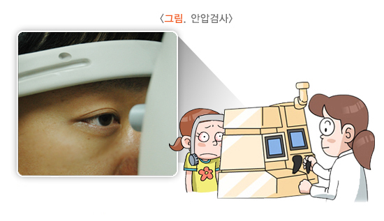 주로 선별검사로 비접촉 안압계를 널리 사용하며, 압축 공기를 뿜어 각막의 반사를 이용해 안압을 측정합니다. 골드만 압평안압계는 세극등현미경을 이용하여 안구에 직접 접촉해 안압을 측정하는 방법으로, 비접촉 안압계보다 정확하다고 알려져 있습니다.