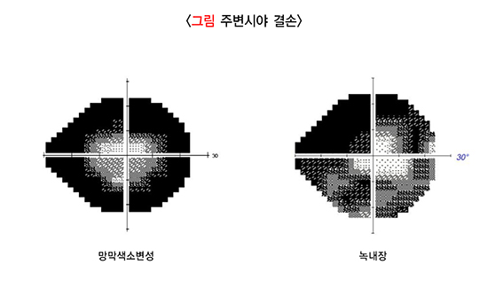 중심시야는 유지되어 중심부 시력은 남아있으므로 바로 앞을 볼 수는 있으나, 주변시야가 좁아져 주변부가 잘 보이지 않습니다. 속칭 터널시야로 불리며 매우 진행된 망막색소변성이나 녹내장 환자에서 볼 수 있습니다.