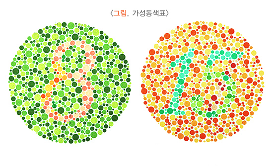 가성동색표는 다양한 색깔의 점 사이에 점으로 문자나 숫자가 그려져 있습니다. 문자를 정확히 판독하지 못할 경우 색각이상을 의심할 수 있습니다. 색각이상은 황반이나 시신경질환의 초기 지표가 될 수 있습니다.