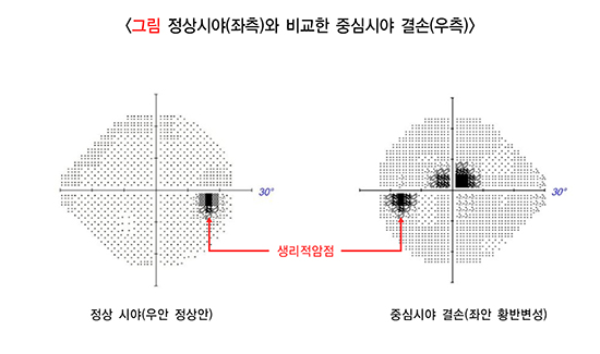 중심시력이 손상받으면 보려고 하는 곳이 선명하게 보이지 않고, 시야에서 특정 지역이 보이지 않는 암점이 생깁니다. 따라서 글씨를 읽거나 먼 거리에서 사물의 세밀한 부분을 구별하기가 어려워집니다. 그러나 주변부 시야는 보이는 경우도 있어 상의 움직임을 파악하는 능력은 유지됩니다.