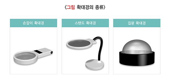 돔(dome) 형태의 렌즈로 빛을 모아서 별도의 전원 없이도 밝게 보이므로 집광 확대경이라고 부릅니다. 2배 정도의 확대 배율를 얻을 수 있습니다. 사용이 편리하므로 기구 사용이 익숙하지 않은 소아 저시력 환자나 노인에게 추천됩니다.