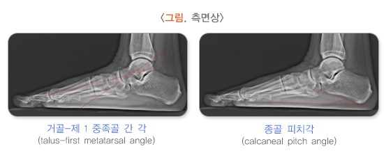 거골 몸체의 상부 관절면의 후방 끝과 거골두의 관절면의 중장을 잇는 거골의 축이 제 1 중족골의 중앙선과 일직선일 경우를 정상, 거골 축이 제 1 중족골의 축의 바닥쪽을 향하면 편평족, 배부를 향하면 요족, 그 각도가 바닥쪽이나 배부로 4도까지는 정상으로 간주합니다.