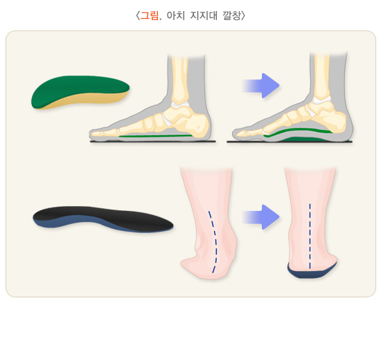 증상이 있을 경우 아치 지지대 깔창을 신발 내에 착용할 수 있습니다. 아킬레스 건이 단축되어 있는 경우에는 건 스트레칭이 필요하며 효과가 입증된 것은 아니지만, 발가락 끝으로 걷게 하거나 발가락 올리기 운동을 반복시켜 후 경골근을 강화시키는 운동도 시행해 볼 수 있습니다.
