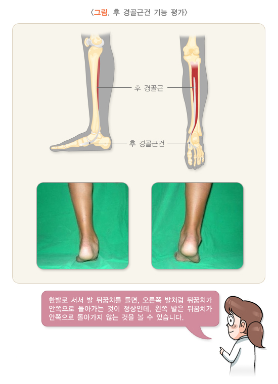 대체로 한 쪽 발에 발생하며, 만성적으로 점차 증상이 진행됩니다. 뒤꿈치 올림 검사를 통하여 후경골근 건의 기능을 평가합니다. 심한 기능 상실이 있으면 뒤꿈치를 들어올리지 못합니다. 후경골근 건은 뒤꿈치를 들면서 안쪽으로 돌아가게 하는데, 이러한 현상이 일어나는지 관찰합니다. 후경골근 건의 기능 장애가 의심스러운 경우에는 여러 번 반복적으로 뒤꿈치를 들게 하여 정상 발과 차이가 있는지를 관찰합니다. 후경골근 건의 주행을 따라 부종이나 압통이 있는지 검사합니다.