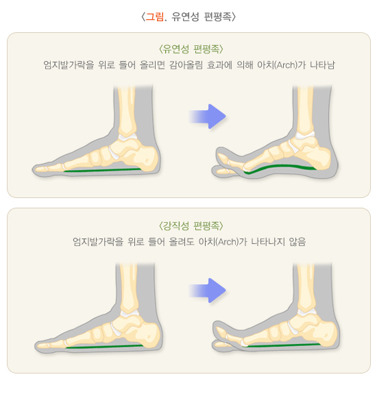 발이 쉽게 피로하거나 통증이 있는지 확인합니다. 체중 부하 시 편평족이 있을 때, 엄지 발가락을 위로 들어올려서 아치가 나타나면 유연성이고, 나타나지 않으면 강직성이라고 합니다.