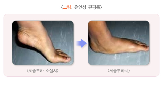 강직성 편평족은 체중부하와 관계 없이 족저부가 편평하며, 아치가 소실된 상태가 유지됩니다.