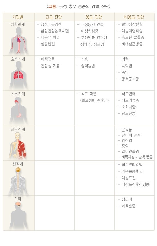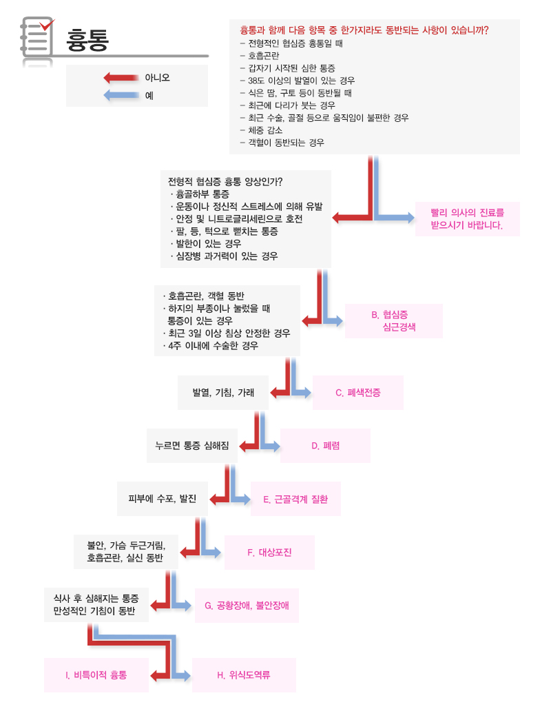 이런 흉통이 매우 갑작스럽게 생기고 통증의 정도가 쪼그려 앉아야 하고 식은땀이 날 정도로 심각하다면 바로 주위의 도움을 요청하고 119를 불러야 합니다. 심근경색증, 폐색전증, 대동맥박리와 같이 생명과 직결되는 질병일 수 있으므로 빨리 응급실로 가야 하고, 매우 서둘러서 원인을 밝히고 치료를 시작해야 합니다.
