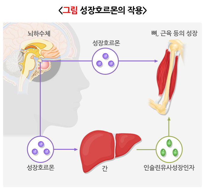 성장호르몬은 뇌하수체 전엽에서 분비되며, 직접적으로 뼈와 근육 같은 조직에 작용하여 성장을 촉진하는 동시에 간에서 인슐린유사성장인자를 생성하게 합니다. 인슐린유사성장인자는 성장호르몬의 주요 매개체로서 체내 성장과정을 돕습니다. 또한, 성장호르몬은 세포 성장, 단백질 합성, 지방 분해, 혈당 조절 등 다양한 신진대사 과정에도 중요한 역할을 담당합니다.
