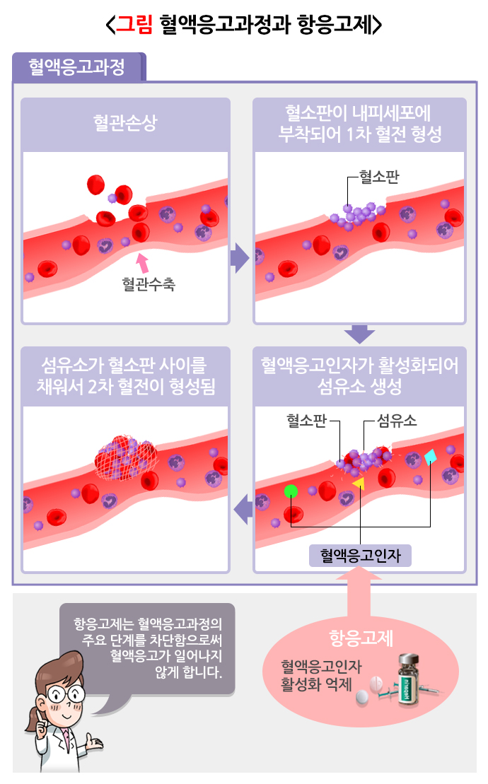 몸에 상처를 입고 출혈이 생기면 혈관 밖으로 나온 혈액은 응고 과정을 거쳐 액체 상태에서 굳어진 덩어리로 바뀝니다. 혈액은 혈관 내에 이물질이 있을 때에도 응고하는 성질이 있습니다. 이러한 혈액의 응고 성질은 과도한 출혈을 막기 위한 것으로, 정상인이라면 누구나 가지고 있는 일종의 자가 방어 기전입니다. 그런데 비정상적으로 혈액이 혈관 속에서 응고되어 혈전(피떡)이 만들어지고 심지어 생명에 위협이 될 수 있습니다. 이러한 환자는 정상적인 혈액 응고 성질을 억제하는 항응고요법이 필요합니다. 이때 사용하는 약제를 항응고제라고 합니다. 항응고제는 작용기전에 따라 헤파린 유도체, 쿠마딘 유도체, 비타민 K 비의존성 경구 항응고제로 구분할 수 있습니다.