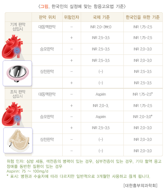 항응고요법은 기계판막 치환술을 시행받은 모든 환자에게 필요합니다. 현재 미국이나 유럽에서 항응고제 와파린 사용 시 목표로 하는 국제표준비율(INR)은 우리가 실제 임상에서 목표로 하는 수치보다 약간 높습니다. 그러나 국내에서는 아직 대규모로 시행된 연구자료가 없어서 대체로 INR을 활용합니다. 국내 흉부외과 학회에서는 국내 실정에 맞춰 아래 표와 같은 기준을 권고합니다.