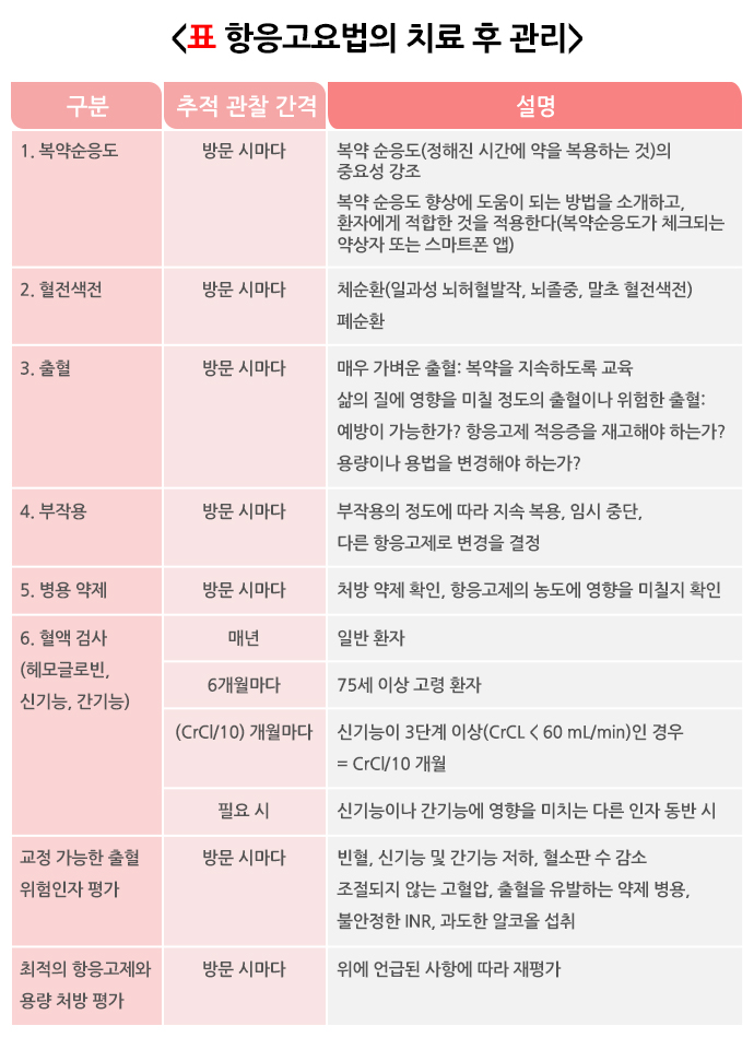 고위험도의 심방세동 및 인공 심장 판막 삽입, 심부 정맥 혈전증이 있는 경우는 중풍, 전신 색전증 및 폐 색전증 등의 합병증을 예방하기 위해 항응고제의 투약이 필요합니다.