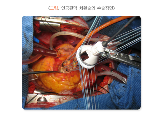 아래 그림은 기계판막을 삽입하는 모습이며 기계판막을 삽입하면 혈전이 잘 생기기 때문에 와파린 복용이 필수적입니다.