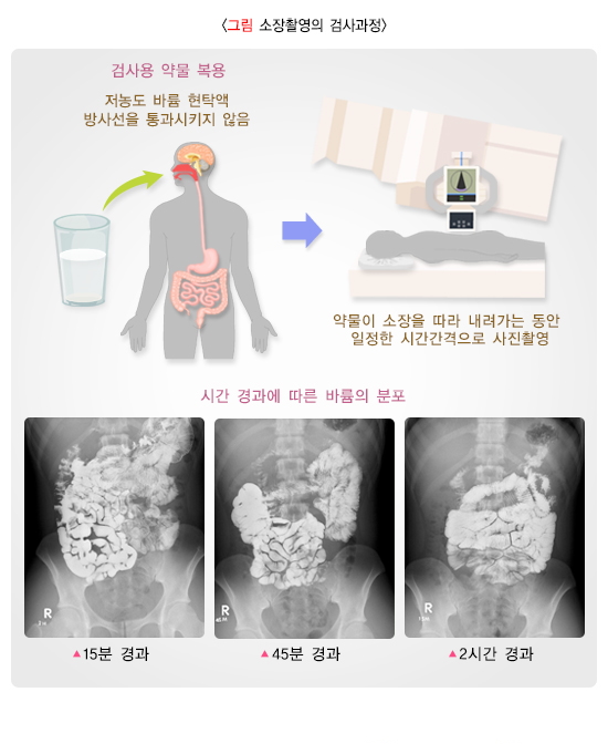 소장 촬영은 방사선 투시조영기라는 기계를 이용하여 진행합니다. 투시조영이란 연속적으로 방사되는 X선을 인체에 투과하여 영상을 얻는 방법으로, 영상은 모니터를 통해 실시간 관찰이 가능하고 동영상 또는 정지 화면으로 촬영이 가능합니다.