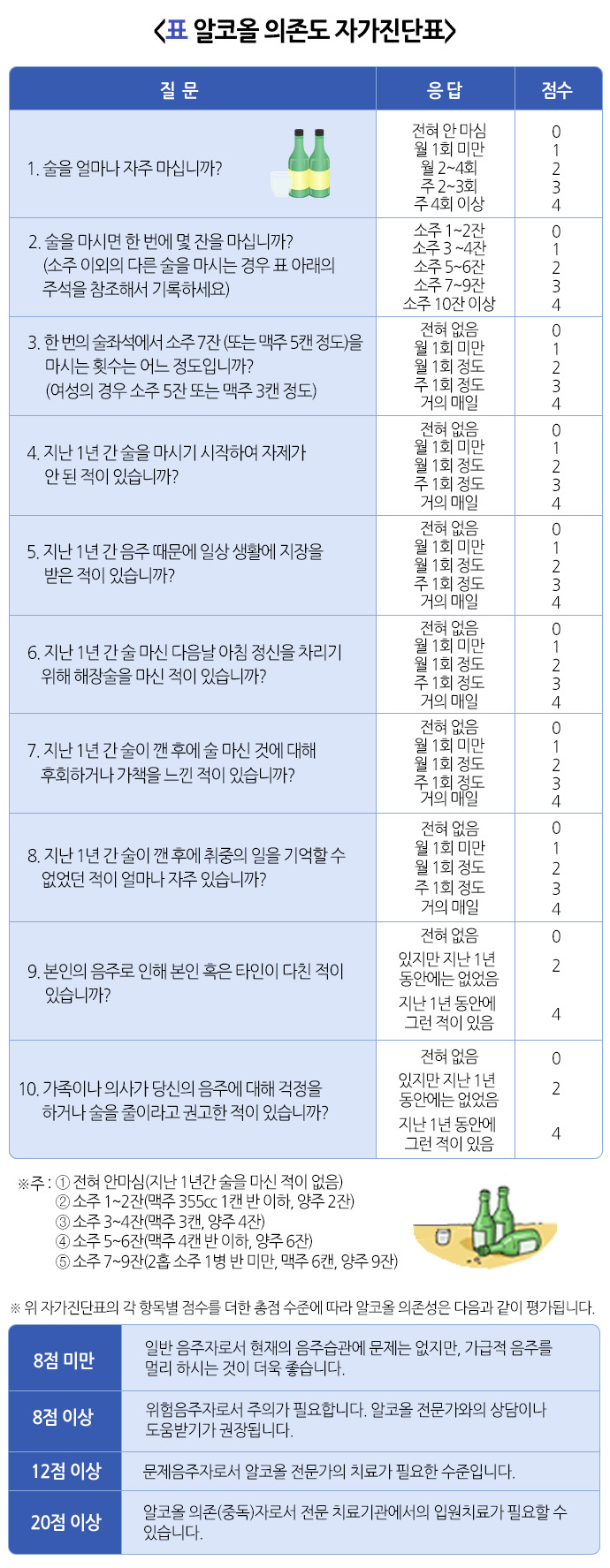 세계보건기구(WHO) 등에서는 조절능력의 상실과 부정적 결과에도 불구하고 계속해서 알코올을 섭취하는 현상을 ‘알코올 의존증(알코올 중독)’이라고 정의하고 있습니다. 알코올 의존성은 다음과 같은 알코올 의존도 자가진단표를 통해 평가해볼 수 있습니다.
