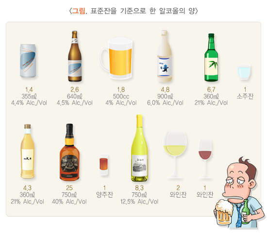 물론 술에 포함된 알코올을 그램으로 계산하는 것이 가장 정확하겠지만, 술마다 알코올의 양이 다르고 술잔의 크기도 다르므로, 편의상 각 술에 적절한 한 잔의 술을 ‘1 표준잔’이라고 부르고 있습니다. 음주량을 측정할 때의 ‘한 잔’이란 ‘표준잔(standard drink)’을 의미하며, 우리나라에서의 1 표준잔이라고 한다면 소주 1잔을 생각하시면 됩니다. 표준잔을 한 단위로 우리가 흔히 마시는 술의 양을 계산하여 보면 355 mL짜리 맥주 1캔은 1.4 표준잔, 소주 1병은 6.7 표준잔에 해당합니다. 또한 막걸리는 약 5 표준잔, 와인은 잔의 크기에 따라 1~2 표준잔에 해당합니다.