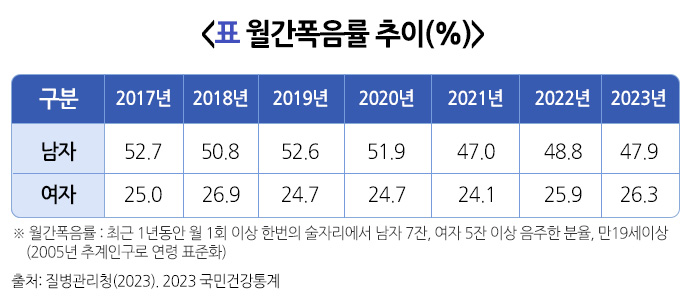 2023년 국민건강통계(보건복지부) 결과에 따르면, 19세 이상 중 '1회 평균 음주량이 남자는 7잔 이상, 여자는 5잔 이상을 주 2회 이상 음주한 분율’을 의미하는 고위험음주율은 남자와 여자가 각각 19.9%와 7.7%로, 남자는 이전보다 감소하는 추세이나 여자는 2012년 이후 지속해서 증가하는 양상을 보였습니다. ‘최근 1년 동안 월 1회 이상 한 번의 술자리에서 남자는 7잔, 여자는 5잔 이상 음주한 분율’에 해당하는 월간폭음률은 남자에서는 47.9%, 여자는 26.3%로서 남자에서 훨씬 높았으나, 최근 들어 남자는 다소 감소 추세를 보이고 여자는 소폭 증가하는 양상을 보입니다.