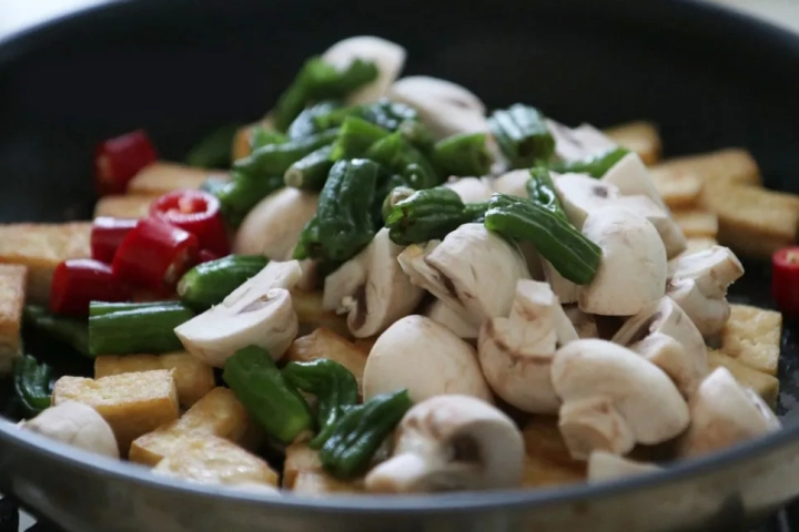[재료]: 두부 1모, 꽈리고추, 홍고추, 버섯