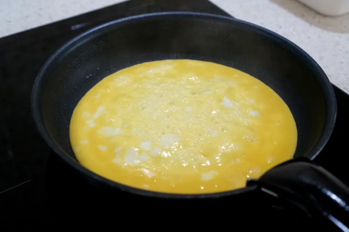 달군 팬에 계란물을 얇게 부어 지단을 만들어주고