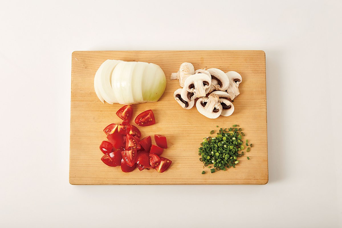 양파 1/2개, 양송이버섯 3개, 방울토마토 6개, 쪽파 1대, 피자치즈