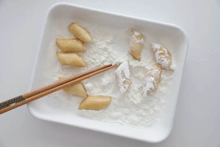 밑간이 잘 배이면 전분가루를 묻혀주세요.