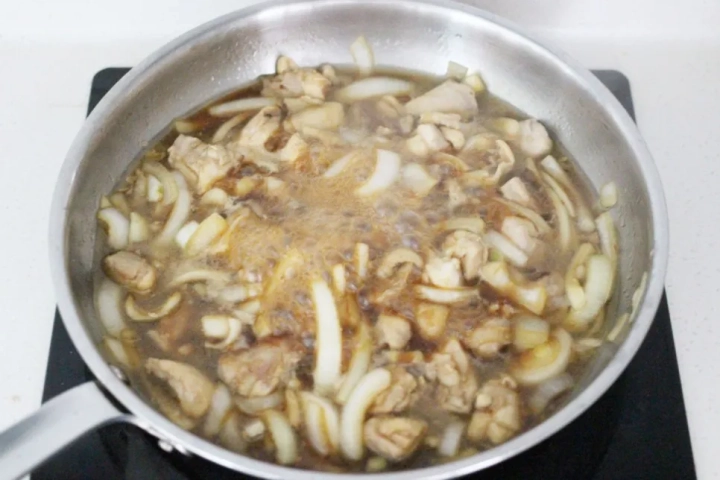 닭고기가 어느 정도 익으면 양파를 더해 골고루 볶아주세요.